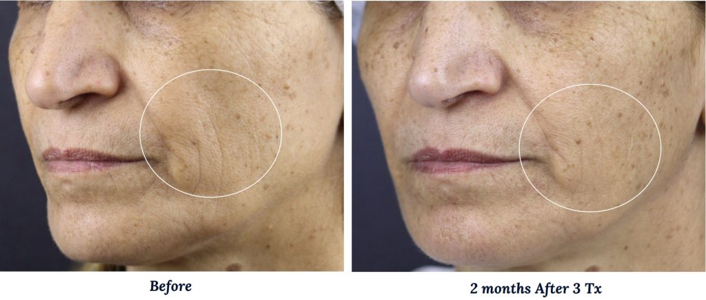 Early textural bounce often appears within 3–6 weeks, with firmer, more substantial skin quality unfolding over 3–4 months as collagen matures.